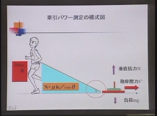 レジステッド走によって、30mの距離を3段階の負荷をかけてタイムを測定し、個々の最大牽引パワー(MPP)を算出。その値を教室にある蛍光灯(wattや、馬力などと比較対比させることで生徒の興味や関心を高める。基本的なレジステッド走の実施方法を楽しみながら学んでいく。